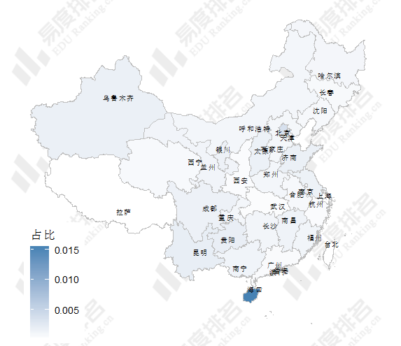下图展示了全国各省(市,自治区)农业经济管理类专业招生计划数占比,全国各省(市,自治区)农业经济管理类专业招生计划数占比在0.03%和1.6%之间。除海南省外,其他各省(市,自治区)对农业经济管理类人才的需求相对较低。