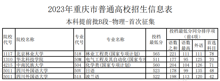 2023重庆普通高校招生信息表-本科提前批B段-物理-首次征集