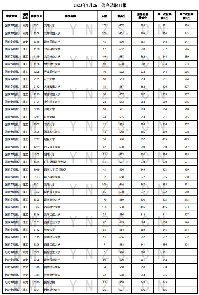 云南2023年7月26日普高录取日报