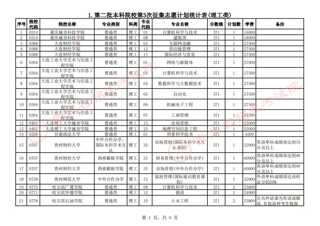 附:1. 第二批本科院校第3次征集志愿计划统计表(理工类)
