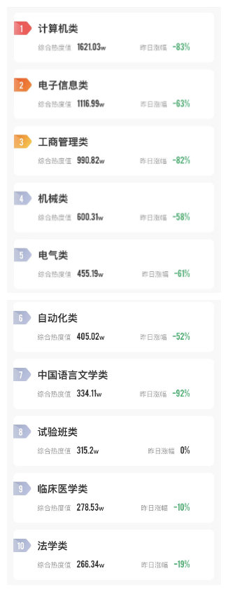 在今年陕西高考生报考热度前十的专业中,计算机类专业位居第一,电子信息类、工商管理类专业紧随其后,占据榜单前三的位置。其余7个专业分别是机械类、电气类、自动化类、中国语言文学类、试验班类、临床医学类、法学类。