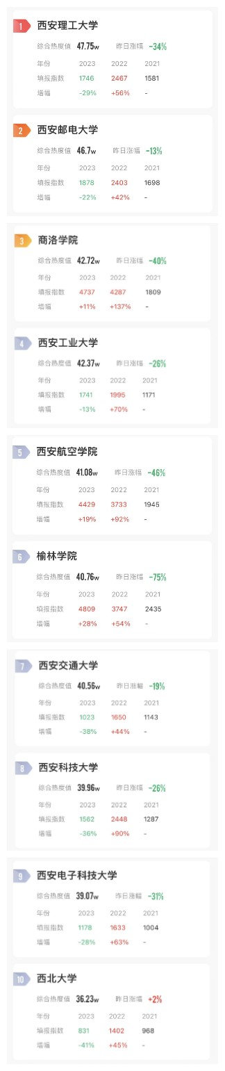 除西安交通大学、西安电子科技大学、西北大学,这三所院校外,报考热度前十的学校均为双非院校,其中有六所为理工类院校,四所为综合类院校;计算机类专业因实力荣登专业报考指数榜榜首!直接碾压电子信息类与工商管理类;从考生偏好的职业榜来看,无论在什么时候,“教师”行业都十分受欢迎,一直是众多考生心目中最向往的职业之一……今年陕西高考生报考情况如何?以下为《优志愿2023年高考指数排行榜》详情: