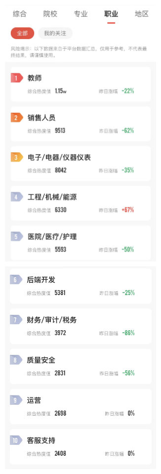 优志愿还整理了陕西省热度前十的职业,从榜单可以看出,教师这一职业的排名持续稳定第一。其他分别为:销售人员、电子/电器/仪器仪表、工程/机械/能源、医院/医疗/护理、后端开发、财务/审计/税务、质量安全、运营、客服支持。