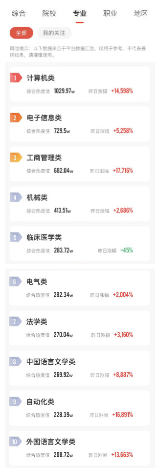在今年云南高考生报考热度前十的专业中,计算机类专业稳居第一,电子信息类、工商管理类专业紧随其后,占据榜单前三的位置。其余7个专业分别是机械类、临床医学类、电气类、法学类、中国语言文学类、自动化类、外国语言文学类。