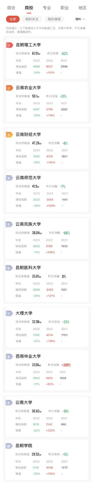 这前十的院校均为云南本地学校,它们分别是:昆明理工大学、云南农业大学、云南财经大学、云南师范大学、云南民族大学、昆明医科大学、大理大学、西南林业大学、云南大学、昆明学院。由此可以看出,大部分云南考生及家长在择校时会优先选择本省的院校,这可能与环境、饮食、分数、招生计划等各方面因素有关。