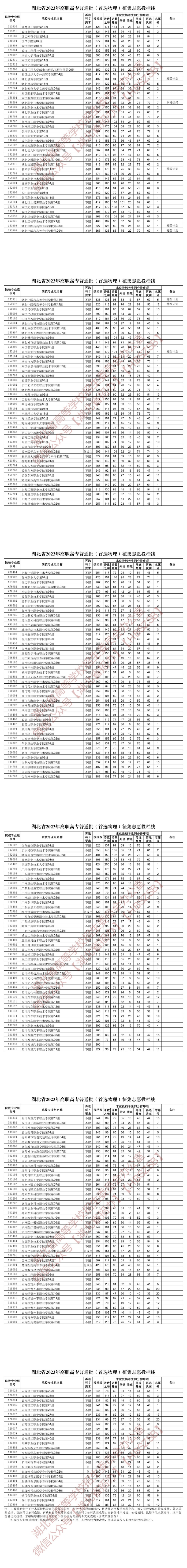 湖北省2023年高职高专普通批(首选物理)征集志愿投档线