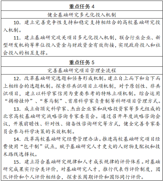 (一)加强顶层设计。组建北京高校基础研究战略咨询专家委员会,加强基础研究顶层设计和统筹协调,研判基础研究发展趋势、凝练基础研究重大需求,在推进重大工作部署中发挥战略咨询作用。深化部门间协同机制,加强市级相关部门统筹协调,精准协同推动各项任务实施。