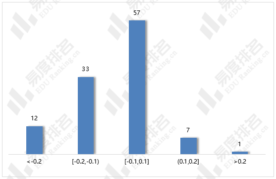 下图展示了天津2023年普通专科批院校投档最低位次百分比与上一年度位次百分比差值的直方图,且以下仅包含位次下降超过2000位的院校。可以看出52%的院校与上一年度的位次百分比差在10%以内,41%的院校位次百分比大幅上涨。