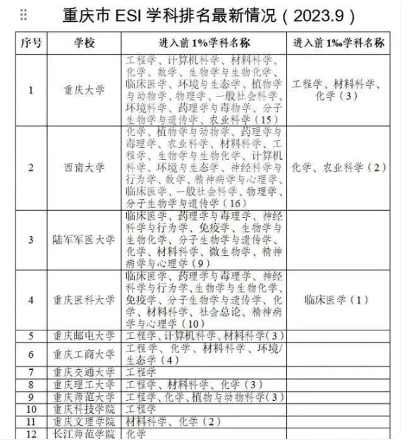 截至目前,共有12所在渝高校68个学科进入ESI世界学科排名前1%,共有6个学科进入ESI世界学科排名前1‰。