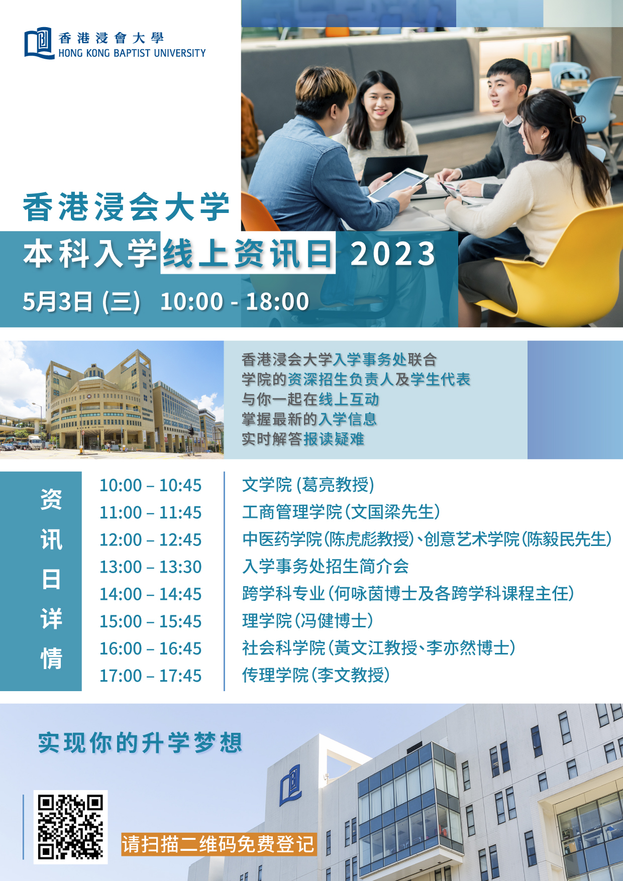 2023年度本科生专业现已接受网上申请,至6月13日截止报名。有关报名及招生详情,欢迎浏览以下网页:https://admissions.hkbu.edu.hk/ug/mainland