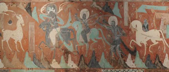 《郊游》敦煌莫高窟第257窟《鹿王本生图》是北魏时期的作品,属敦煌壁画早期作品,其造型用线简练概括,结构清晰合理,构图长卷平铺,色彩协调统一,具有中国传统审美特点,从内容到表现手法都体现出中国传统