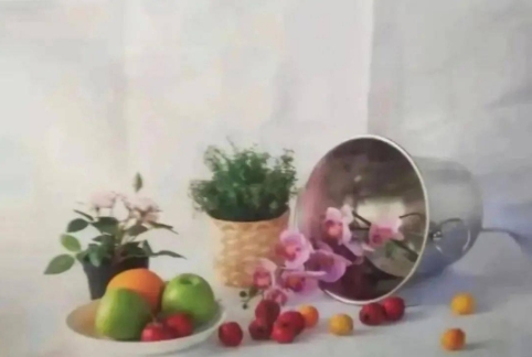 色彩考题:静物组合,照片模拟写生,鲜花、水果、不锈钢桶、衬布等