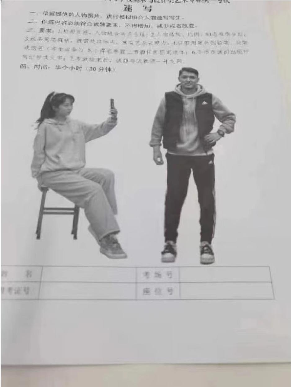考试内容:双人动态组合。一坐姿女青年,正在自拍,一站姿男青年,一手掐腰。