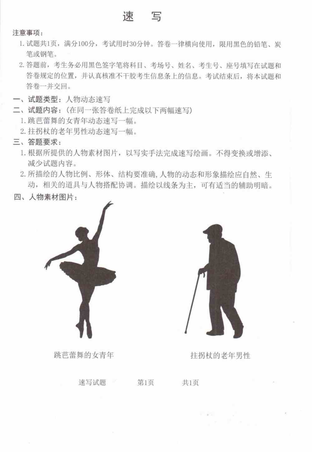 (在同一张答卷纸上完成以下两幅速写)1.跳芭蕾舞的女青年动态速写一幅。2.拄拐杖的老年男性动态速写一幅。