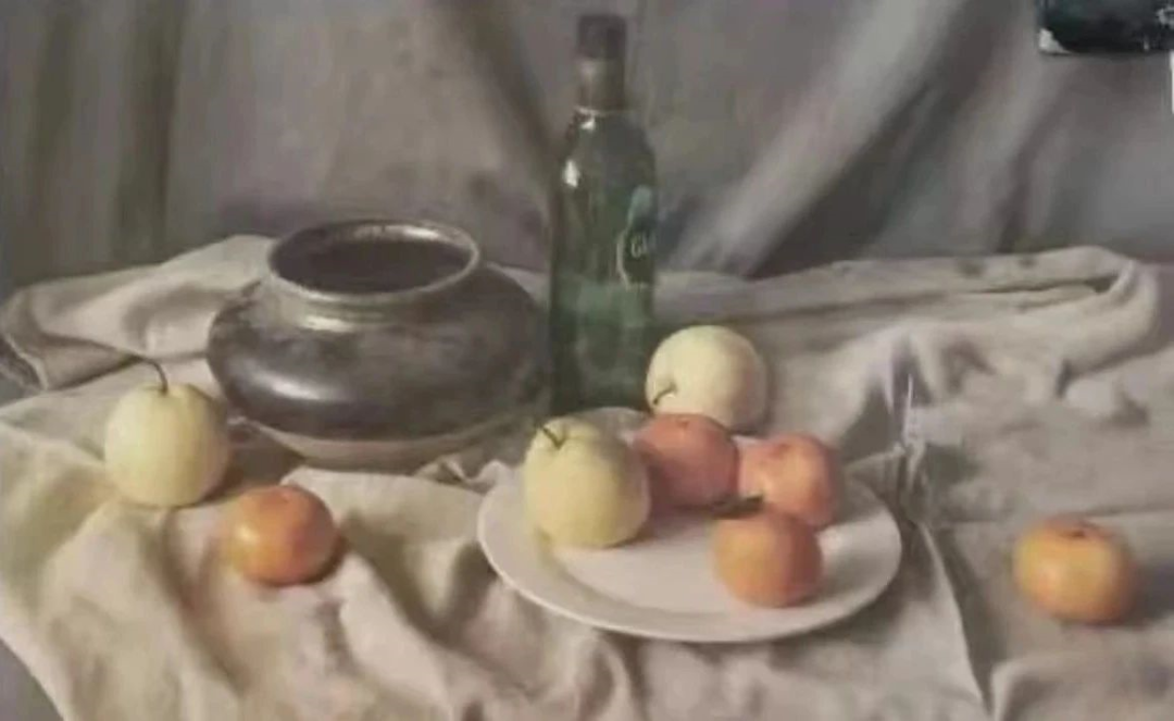 色彩静物组合,半釉陶罐一个,玻璃酒瓶一个,白瓷盘一个,梨子、橘子等水果若干,衬布两块。