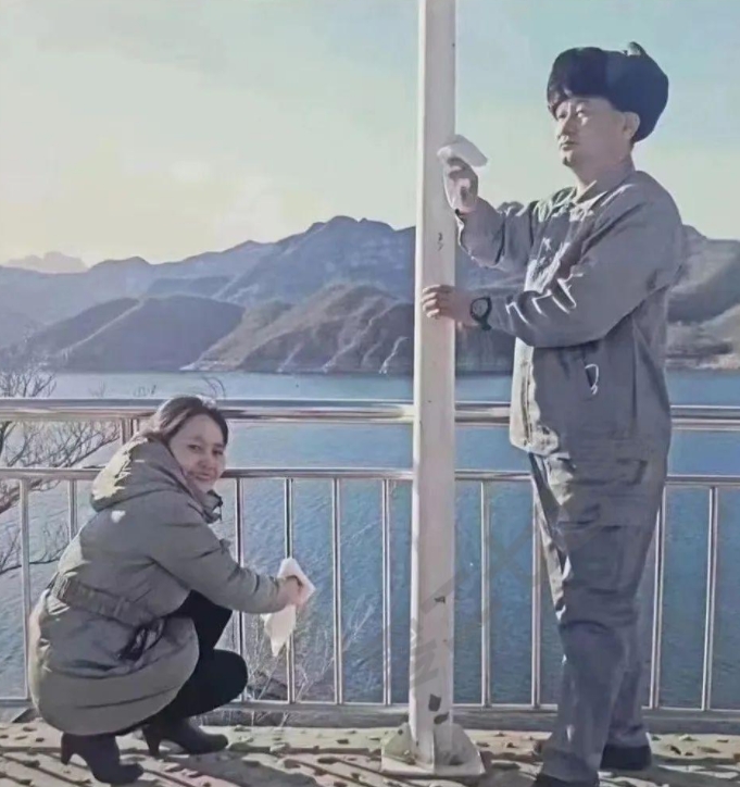 考试内容:双人动态组合。一蹲姿女中年擦栅栏,一站姿男中年擦柱子。