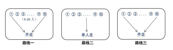 2.自备服装须大方得体,女生须穿高跟鞋(不得带水台),男生须赤足。每人按照规定的3种展示路径进行台步展示,时长不超过 3 分钟。展示路径见下图: