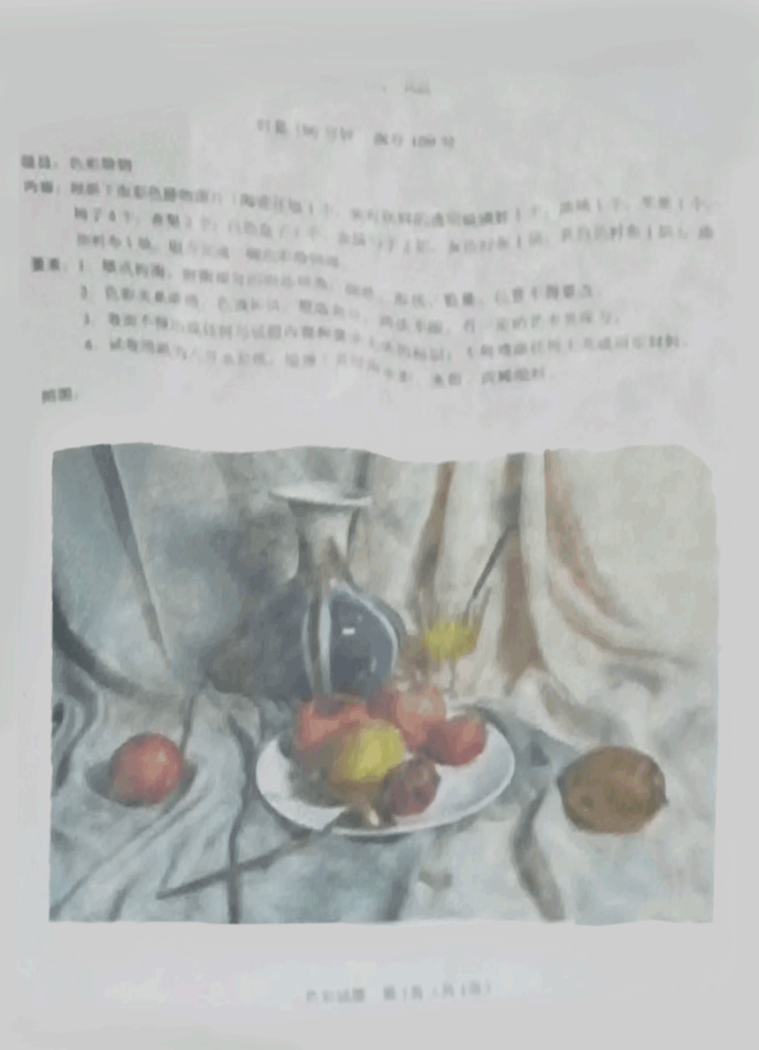 色彩题目:静物写生考试题目:色彩静物组合,主体背景为1块深灰色衬布,另平放一块红色衬布,1把红绳缠绕的军号,1 个石榴,1个苹果,1 个白色陶瓷罐,1个绿色军用水壶,1个长条面包。考试时间:3小时(180分钟)