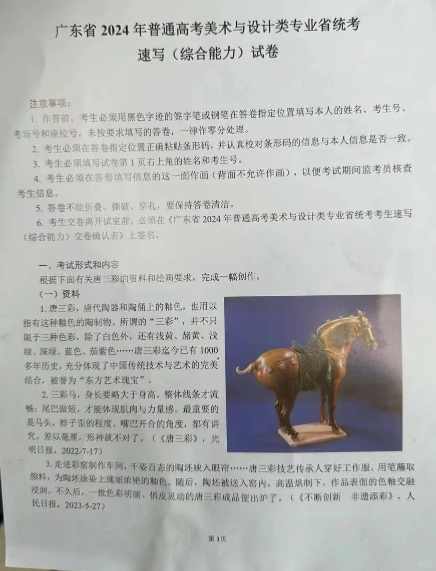 考试题目:根据《唐三彩》的资料,以一位给陶坯涂染釉色的师傅为中心人物,完成一幅创作,画面中不少于4人。画面中,师傅坐着,用笔给桌子上的马(陶坯》涂染釉色(桌子见答卷,创作中不得改变其位置和大小),同时有一人在拍摄师傅涂染釉色的过程可以加上与情节有关的道具和环境.