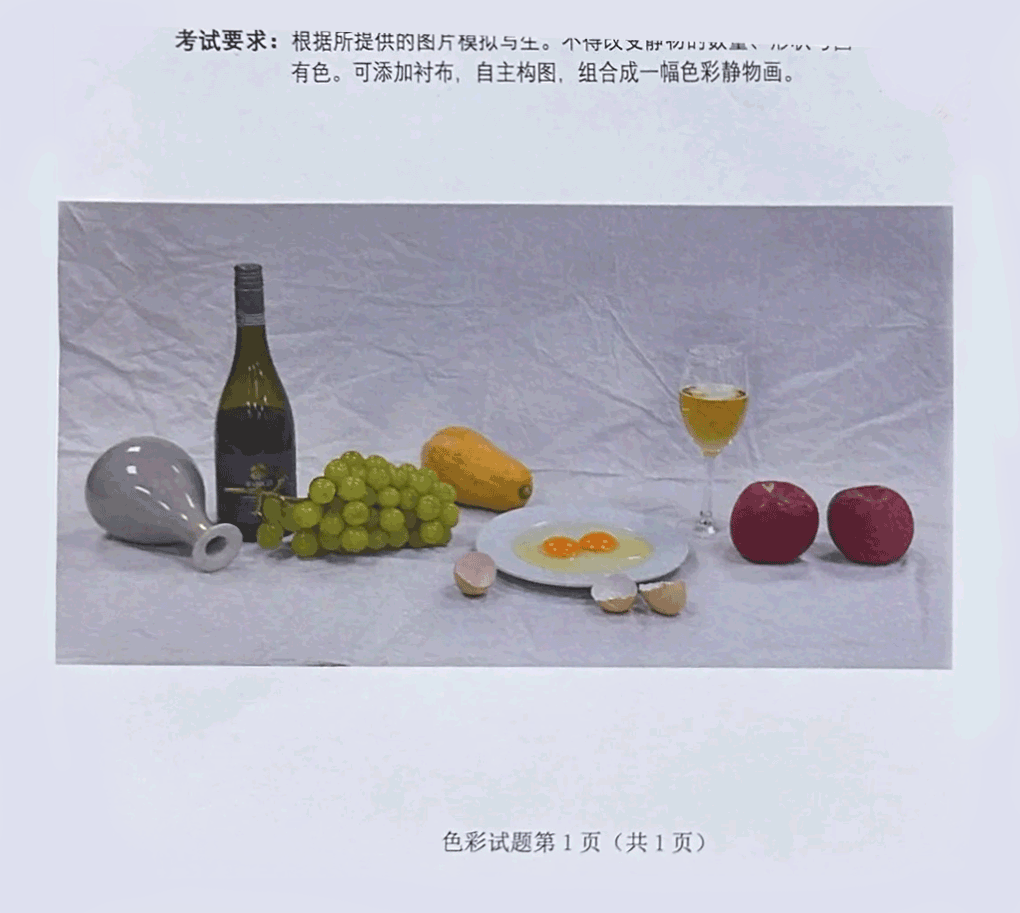 考试题目:根据提供的图片模拟写生。不得改变静物的数量、形状等,可添加衬布,自主构图,组合成一幅色彩静物画。