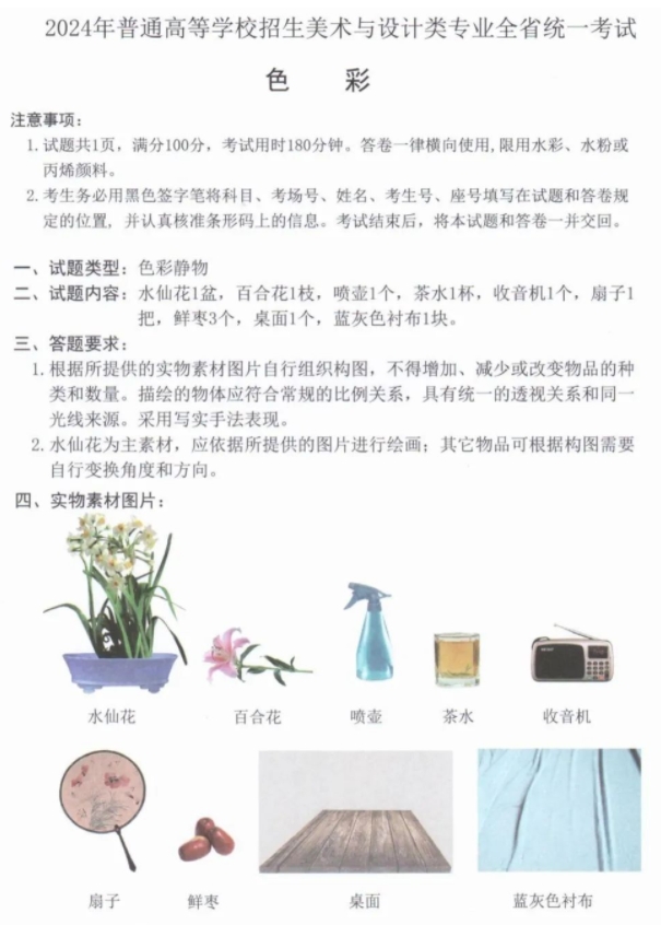 山东2024年美术类专业统考/联考考题(色彩)