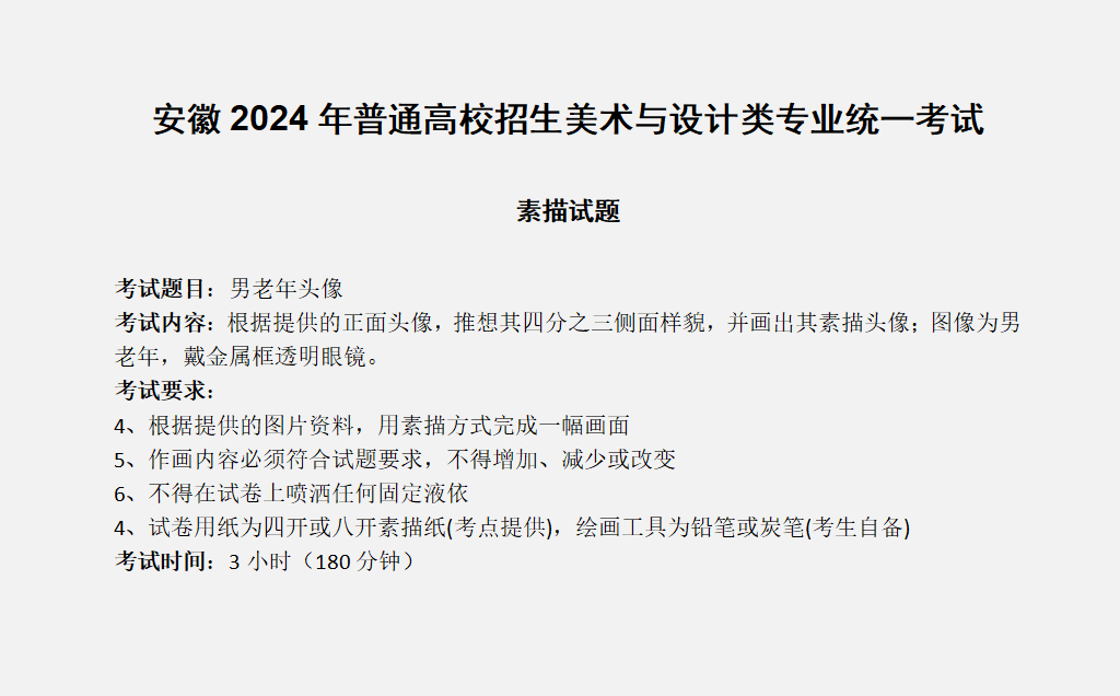 考试题目:根据提供的正面头像,推想其四分之三侧面样貌,并画出其素描头像;图像为男老年,戴金属框透明眼镜。