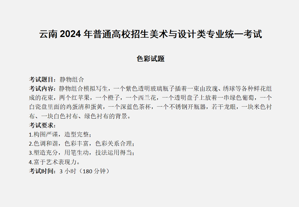 考试题目:静物组合模拟写生,一个紫色透明玻璃瓶子插着一束由玫瑰、绣球等各种鲜花组成的花束,两个红苹果,一个橙子,一个西兰花,一个透明盘子上放着一串绿色葡萄,一个白瓷盘里面的鸡蛋清和蛋黄,一个深蓝色茶杯,一个不锈钢开瓶器,若干龙眼,一块米色衬布、一块白色衬布、绿色衬布的背景。