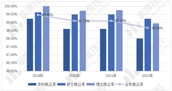 2019-2022年西安交大就业率虽然出现了小幅下降,但各学历层次毕业生就业率均超过98%,其中硕士毕业生的就业率更是超过99%,考入