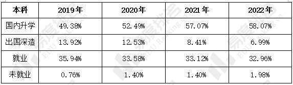 2019-2022年西安交大本科毕业生国内升学率从49.38%上升到58.07%,上升了8.69%,出国深造率则下降了6.93%,升学率有所增加,更多的毕业生选择国内升学。