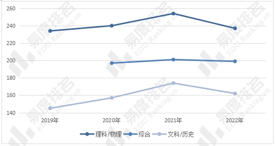 西安交大省外理科/物理、文科/历史、综合的线上分差均于2021年达到最大值,2022年则有所下降,但高于2020年水平,学校报考热度在2022年前逐年上升,2022年则有所降低。