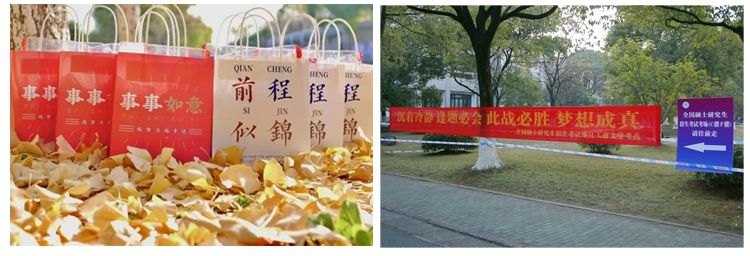 各考点高校还通过校内横幅标语、微信视频、“福袋”等方式纷纷为考生加油。“挥毫烟云落笔疾,马到成功身名立”“沉着冷静、逢题必会、此战必胜、梦想成真”等祝福语一路相随,为迈入考场的学子们增添信心和力量。