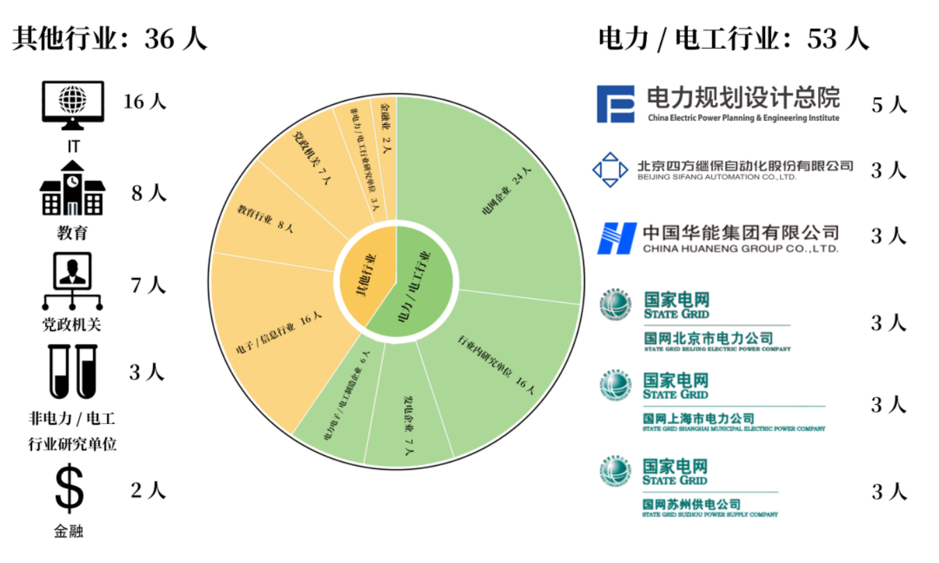 按照实际行业分析,电机系2023届毕业生中共有53人去往电力/电工行业,占就业总人数的59.6%,就业单位遍及电网、发电、装备制造、技术研究等多个子领域。除了电力/电工行业就业以外,有16人去往电子/信息行业,7人去往党政机关,2人去往金融业,3人去往非电力/电工行业研究所;8人进入教育行业,其中6人前往高校从事教学