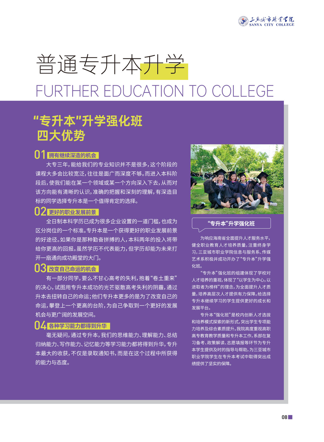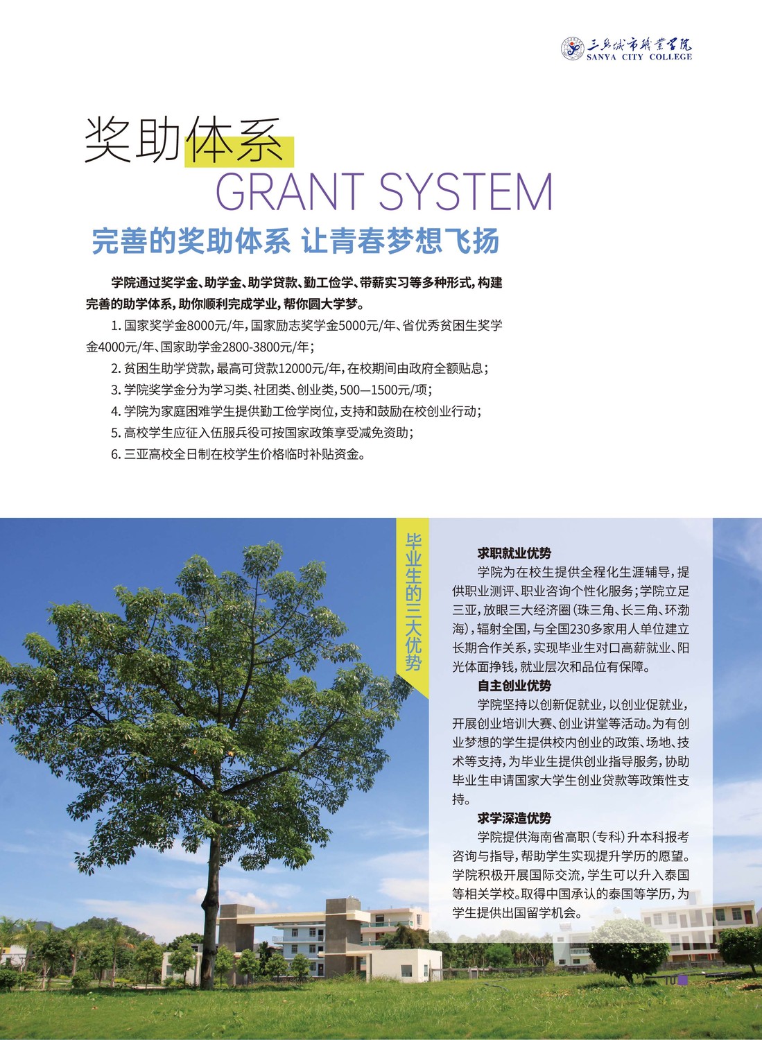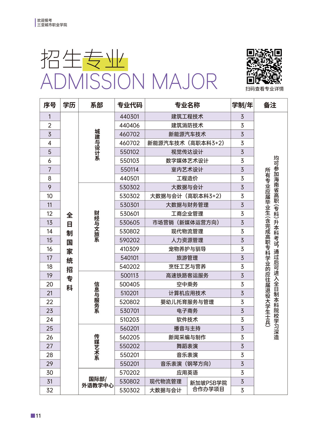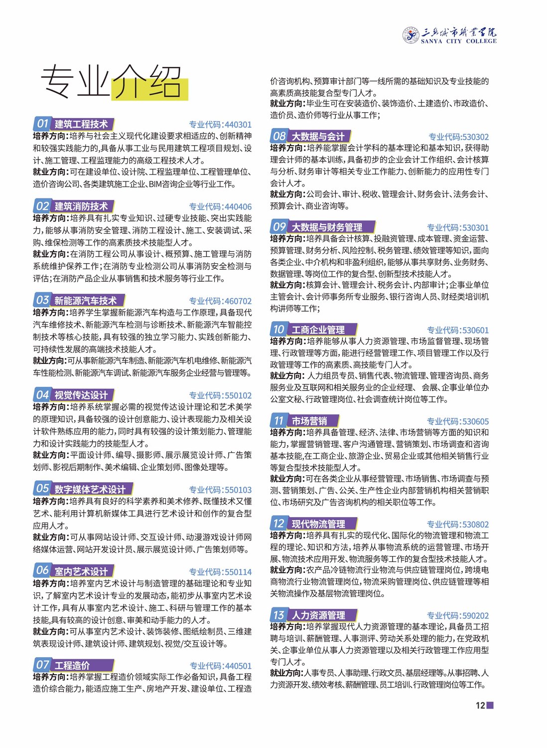 学院是三亚市第一所高校,现有财经与文旅系、城建与设计系、信息与服务系、传媒艺术系。学院创新人才培养模式,争创全国知名应用型国际化职业院校,逐渐形成旅游类,信息与数字媒体类及建筑设计、财经、传媒类等五大专业集群与服务中心,满足社会发展的高标准、高素质人才需求。