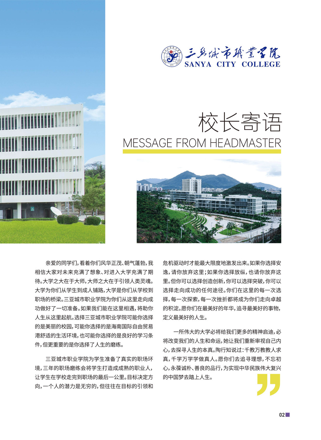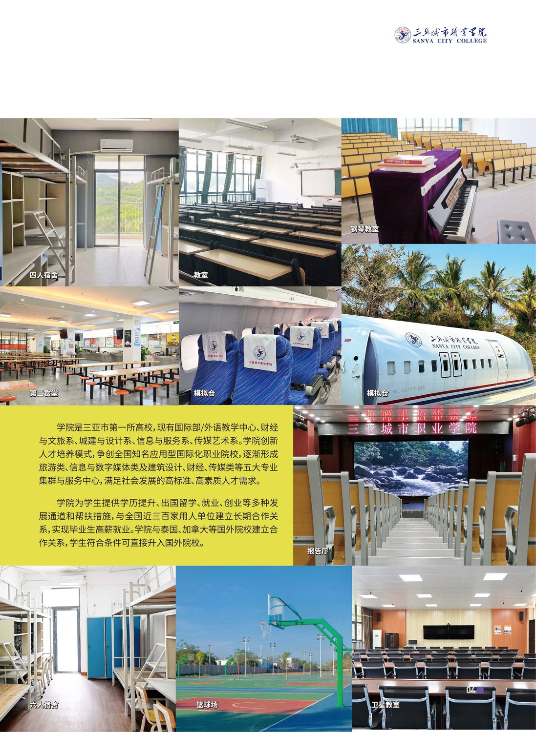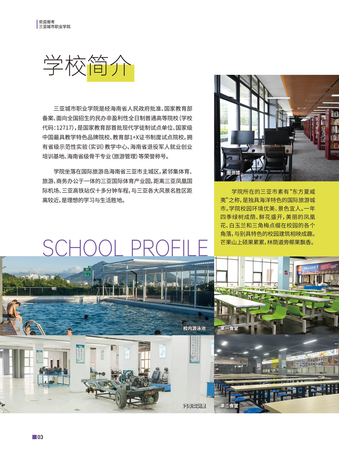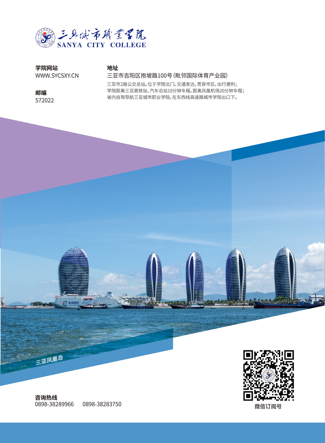 三亚城市职业学院是经海南省人民政府批准、教育部备案、面向全国招生的民办非营利性全日制普通高等院校(学校代码:12717),是教育部首批现代学徒制试点单位、国家级中国最具教学特色品牌院校、教育部1+X证书制度试点院校,拥有省级示范性实验(实训)教学中心、海南省退役军人就业创业培训基地、海南省级骨干专业(旅游管理)等荣誉称号。