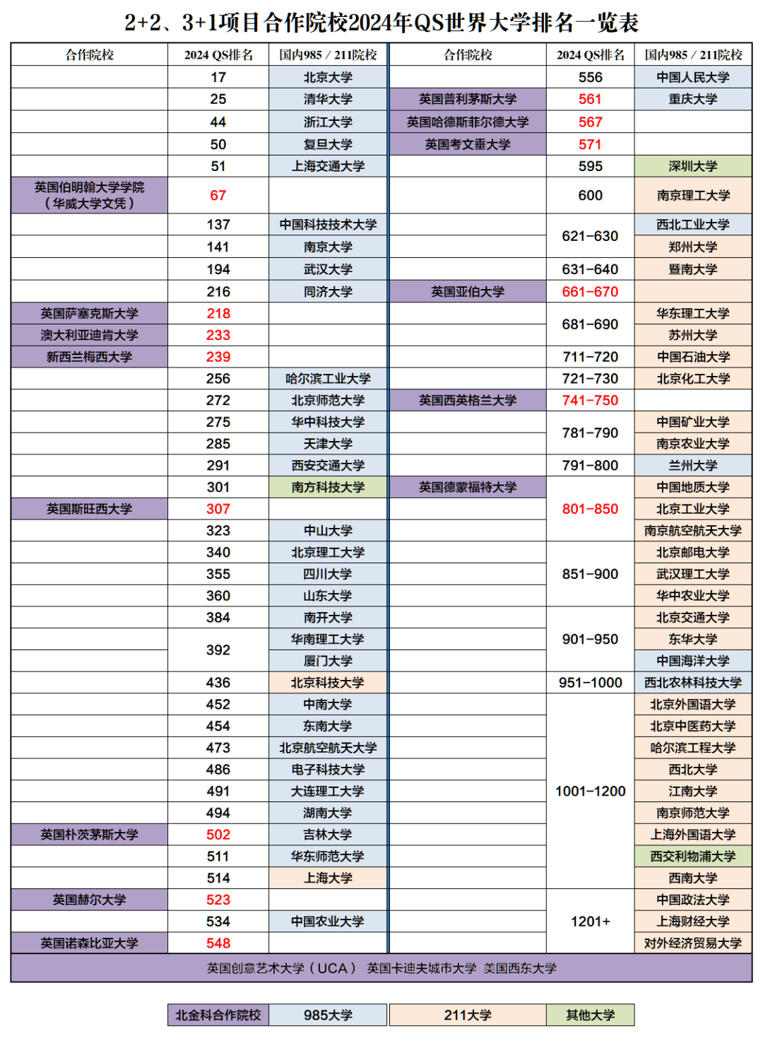 我校目前大部分2+2,3+1,3+1.5的中外联合培养项目的学校,均位列QS全球大学排名前1000名,学生经过2-3年的学习之后,达到绩点(GPA)和雅思成绩录取要求,即可进入与国内985、211QS排名同等水平的合作院校继续本科阶段的学习,成绩合格后将获得学校和合作院校的两个学士学位,之后可以冲刺世界排名顶尖的国际名校完成硕士学位的学习。