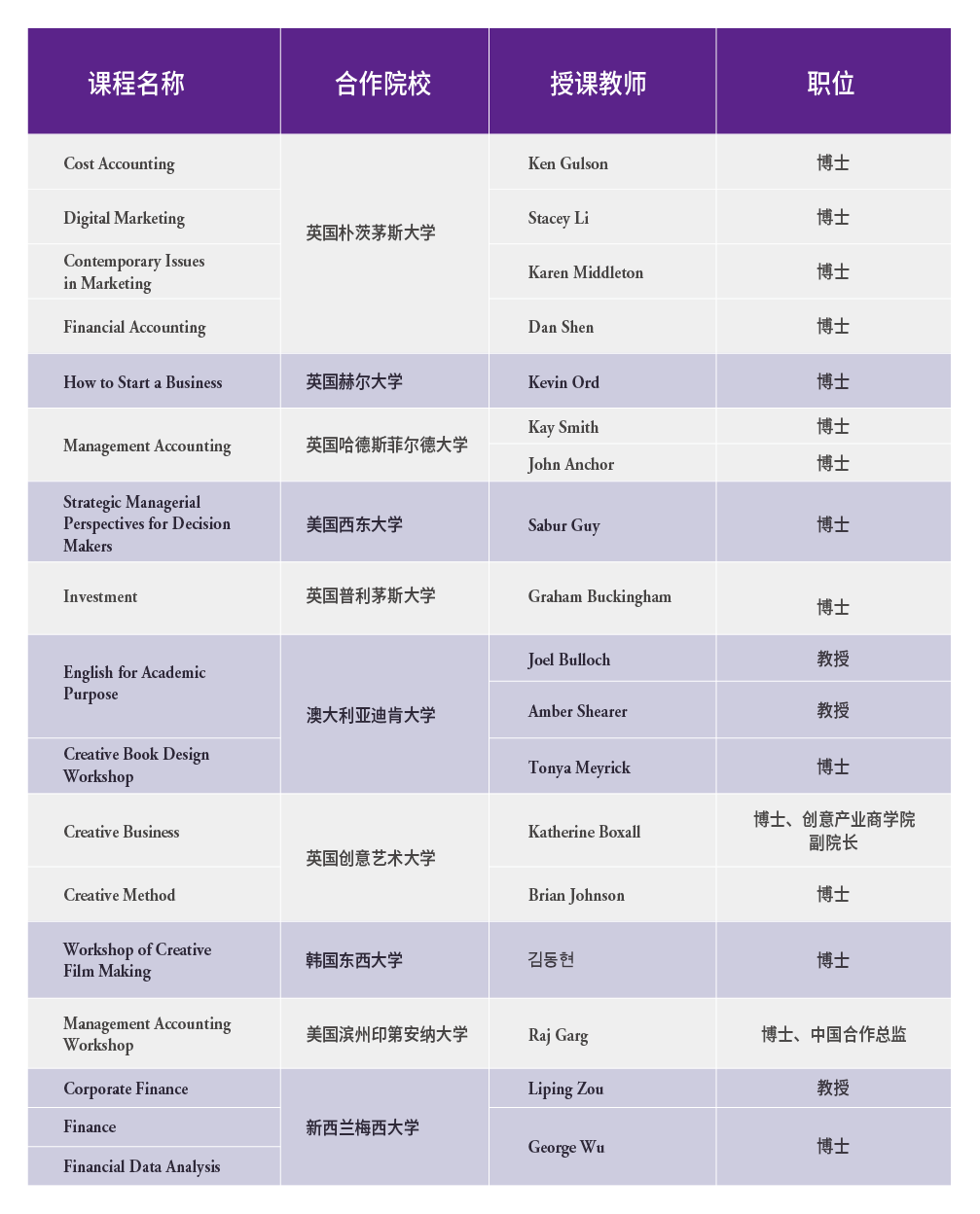为了帮助海外升硕的学生们了解国外学习方式,为未来留学平稳过渡打下基础,学校与合作院校联合打造了30余门国际课程,聘请合作院校的教授,通过线上、线下方式,为学生们讲授专业课程。