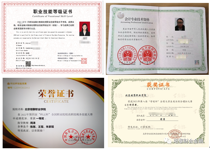 本专业开设的主干课程均已实现了课证融通的教学过程,学生可以考取多项教育部批准的X职业证书,如财务数字化应用职业技能等级证书、业财一体信息化应用职业技能等级证书、金税财务应用职业技能等级证书、财务共享应用职业技能等级证书等,同时还可以参加财政部组织的初级会计专业技术资格职称证书考试。学生在历年北京市高职院校各项技能大赛中均取得了较好的名次,连续多年荣获“学创杯”全国大学生创业综合模拟大赛省赛一等奖。