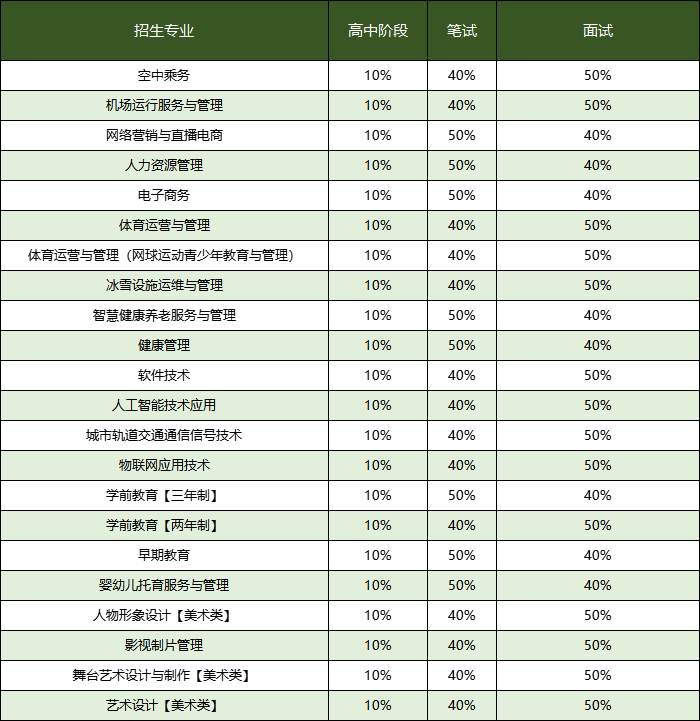 录取时,我院将根据不同类别专业分别确定测试成绩的权重,计算考生的总分。各专业测试成绩权重如下表: