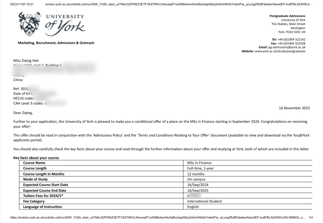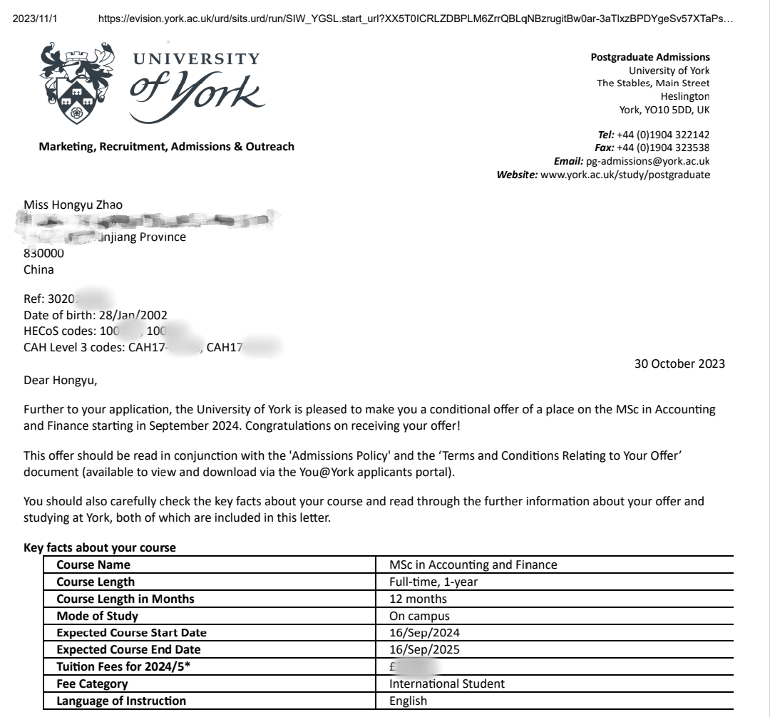 除了澳大利亚悉尼大学,我还申请到了英国约克大学的录取OFFER,约克大学以其高质量教学和突破性的研究而闻名,让我产生了浓厚的兴趣。作为著名罗素集团的成员,约克大学在多个学科领域都拥有优秀的排名,这都能为我提供一流的海外学习体验。