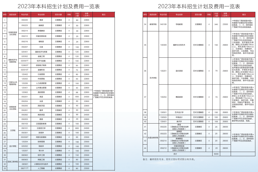 2023年本科招生计划及费用一览表