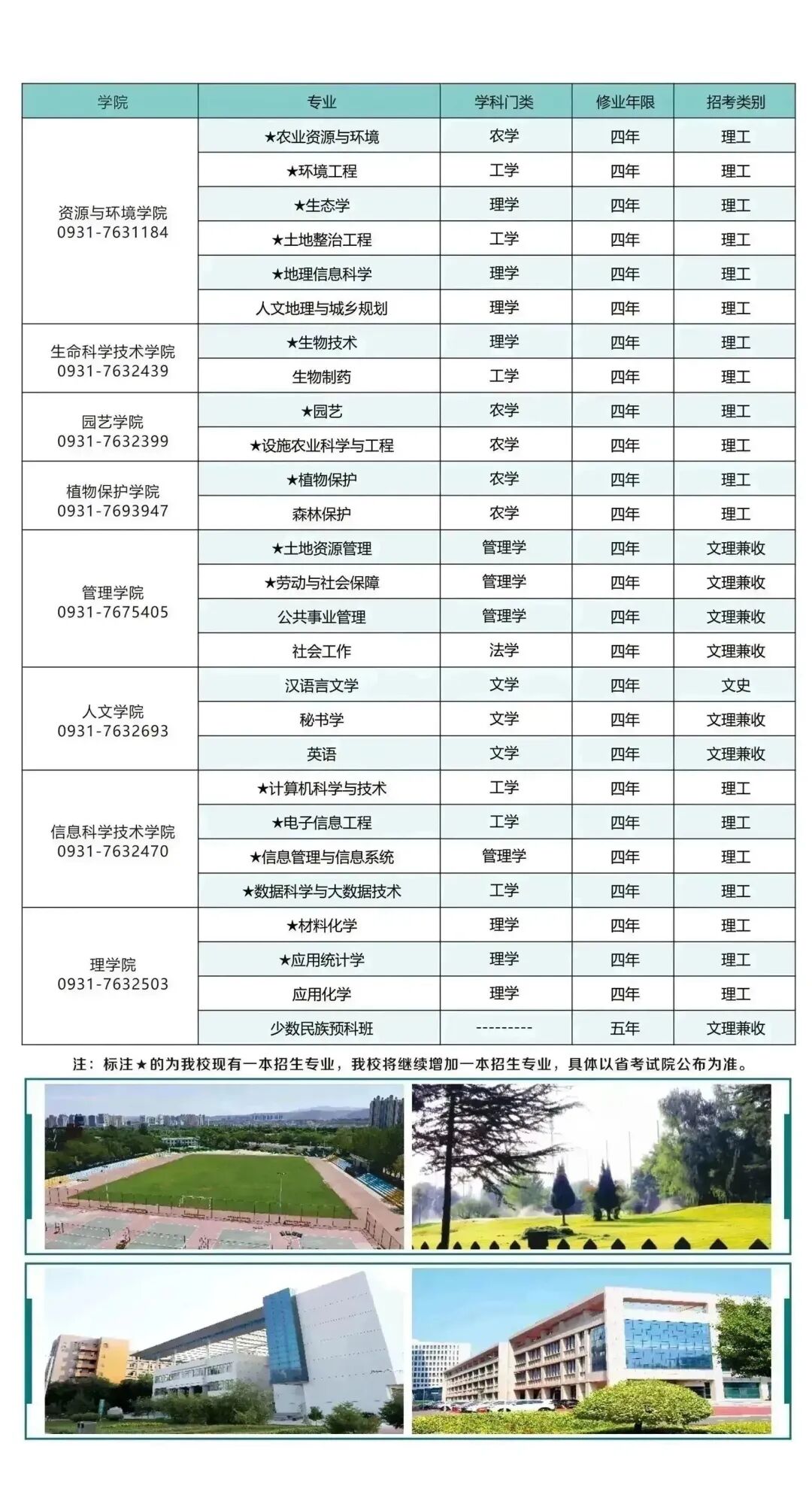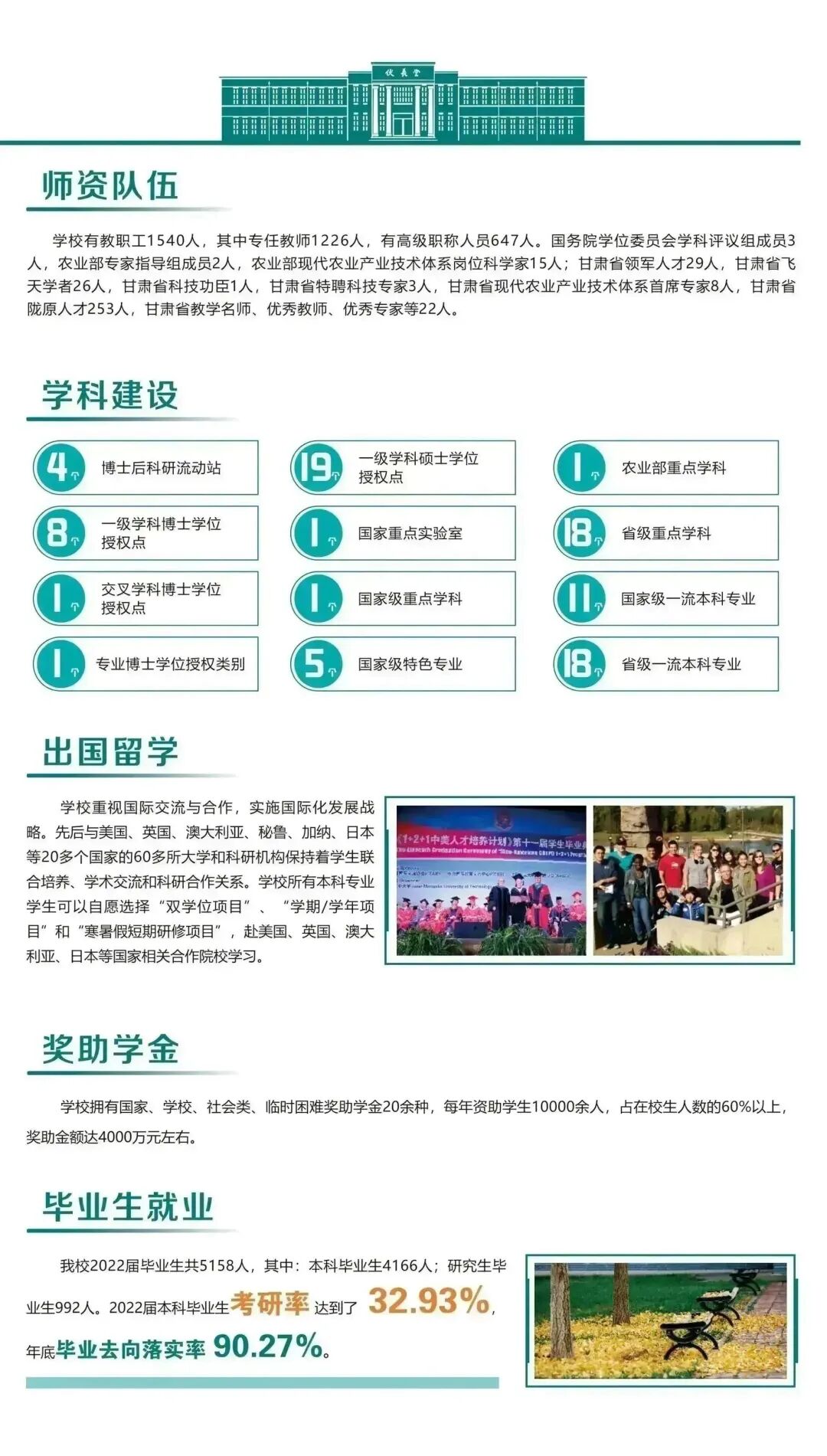 学校坐落在兰州市安宁区,占地158万平方米,建筑面积70万平方米。现设有23个学院(教学部),69个本科专业,拥有食品科学与工程等11个国家级一流本科专业,动物医学等5个国家级特色专业,生物技术等18个省级一流本科专业;1个国家级重点学科(草业科学),1个农业部重点学科和18个省级重点学科。4个博士后科研流动站,8个一级学科博士学位授权点,1个交叉学科博士学位授权点,1个专业博士学位授权类别,19个一级学科硕士学位授权点,11个专业学位授权类别。学校有教职工1532人,其中专任教师1250人,有高级职称人员623人。有国家级高层次人才8人,国务院学位委员会学科评议组成员3人,农业部专家指导组成员2人,农业部现代农业产业技术体系岗位科学家15人,全国优秀教师1人,全国教育系统劳动模范1人,全国杰出专业技术人才1人,全国林业和草原教学名师1人,教育部“新世纪优秀人才支持计划”1人;甘肃省科技功臣1人,甘肃省领军人才29人,甘肃省陇原青年英才3人,甘肃省飞天学者26人,甘肃省陇原人才329人,甘肃省现代农业产业技术体系首席专家8人,甘肃省特聘科技专家3人,甘肃省教学名师、优秀专家、优秀教师27人。 学校从1953年开始招收研究生,是我国高校中首批学士、硕士学位授予单位,第二批博士学位授予单位。现有普通本科生17530人,硕士研究生3438人,博士研究生583人。至今,已为国家培养各类高级专门人才23万余人,涌现了首位华人英国皇家科学院院士杨子恒,中国科学院院士尚永丰、陈化兰,中国工程院院士南志标等一大批知名校友。