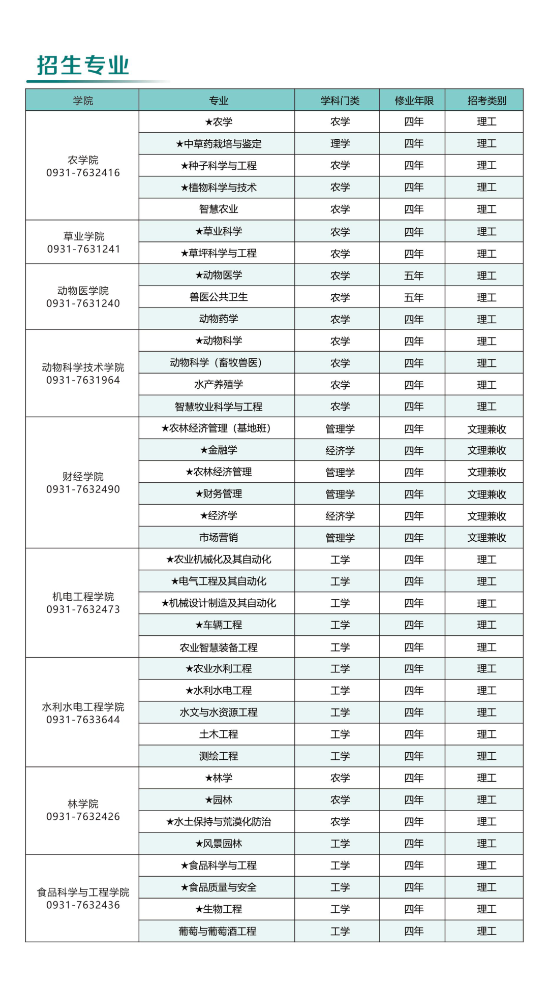 第十五条我校收费标准严格执行甘肃省发改委的有关规定。学费标准:农林经济管理、农林经济管理(基地班)、英语、信息管理与信息系统专业学费为4300元/人·学年。除以上专业外,其他工学类专业学费为4500元/人·学年,农学、理学类专业学费为4300元/人·学年,管理学、文学及经济学类专业学费为3800元/人·学年。6人间宿舍住宿费:900元/人·学年。以上收费标准若有变动,则按相关部门最新批文为准。第十六条我校设有完善的奖、助学金体系。对于品学兼优、家庭困难的学生,建立了多种奖、助学金和勤工助学制度。第十七条对取得学校学籍,学习期满成绩合格的本科毕业生,颁发普通高等教育毕业证书,毕业证书学校名称为甘肃农业大学。符合学位授予条件的,颁发相应学位证书。第十八条招生咨询电话:0931-5108989,学校本科招生网:http://bkzs.gsau.edu.cn。纪检监督举报电话:0931-7631594。第五章 附则第十九条本章程适用于甘肃农业大学全日制普通本科招生工作,由甘肃农业大学招生办公室负责解释。第二十条本章程若与国家或各省(自治区、直辖市)招生主管部门有关政策相抵触,则以国家和上级有关政策规定为准。甘肃农业大学·学院介绍
