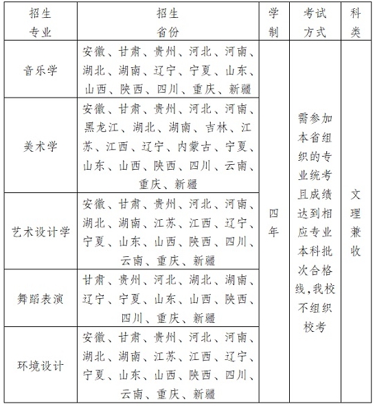 2024年艺术类招生专业包括音乐学、美术学、艺术设计学、舞蹈表演、环境设计5个专业,由于专业不同,招生省份也有所不同,同学们可根据自己是实际情况合理填报。
