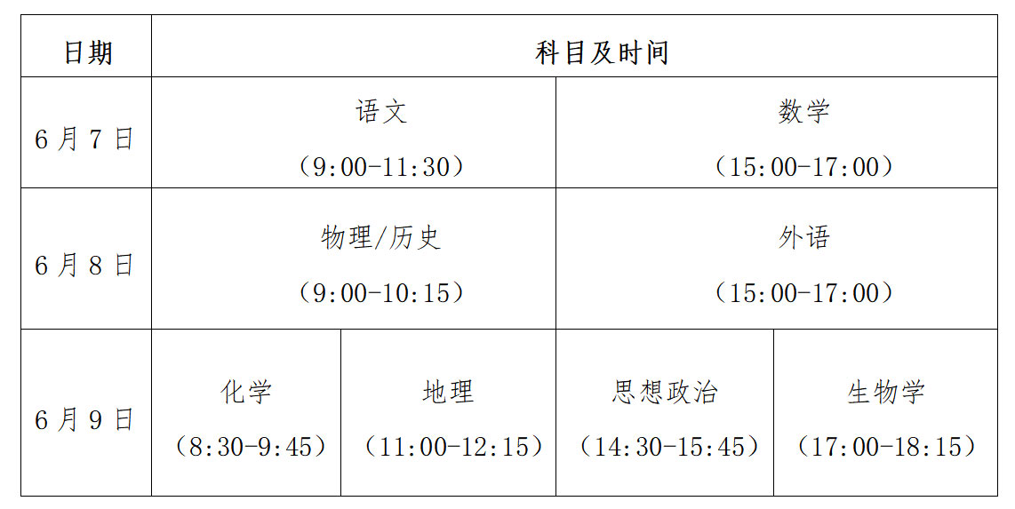 全国统考科目考试时间以教育部公布为准,如有调整,我省选择性考试科目的考试安排做相应调整。