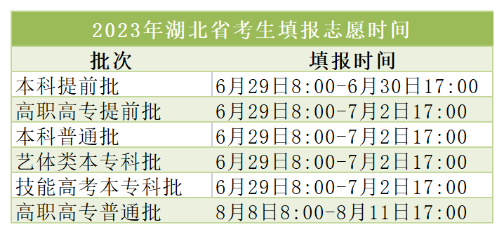 湖北省考生志愿采取网上填报的方式,分两次集中填报志愿,具体时间见下表:
