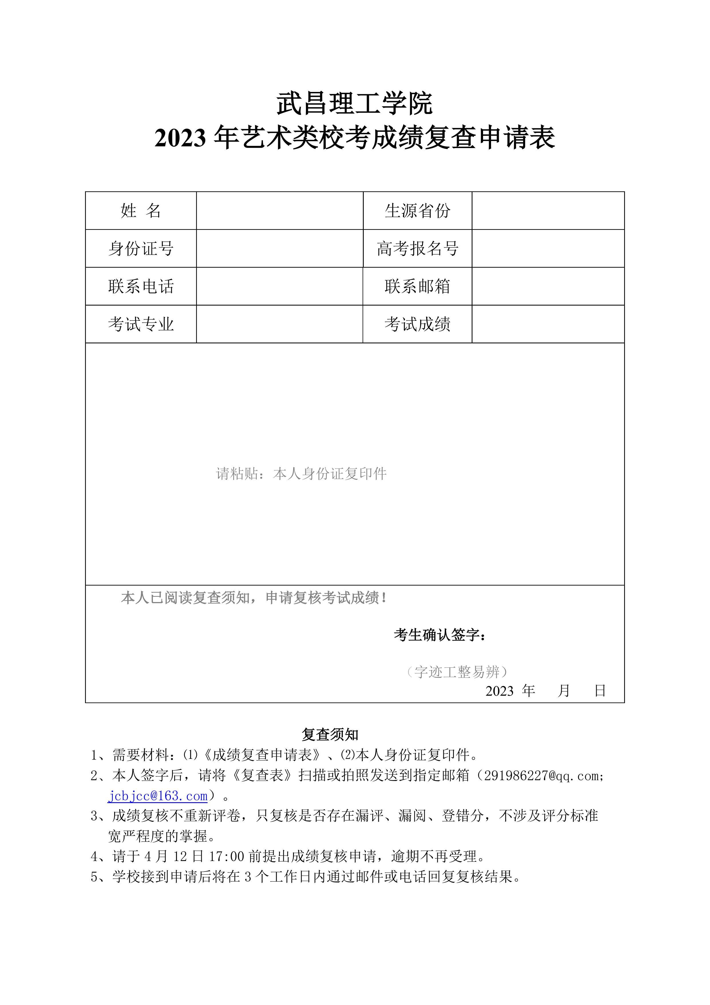 4、成绩复核只复核是否存在漏评、漏阅、登分错,不重新评卷,不涉及评分标准宽严程度的掌握。 ●成绩复核办法 ①下载并按要求填写《 ②按要求填写复查表后,4月12日17:00前扫描或拍照发送到邮箱(291986227@qq.com;jcbjcc@163.com) ③学校接到申请后将在3个工作日内通过邮件或电话回复复核结果。 咨询热线:027-81652828、81652037