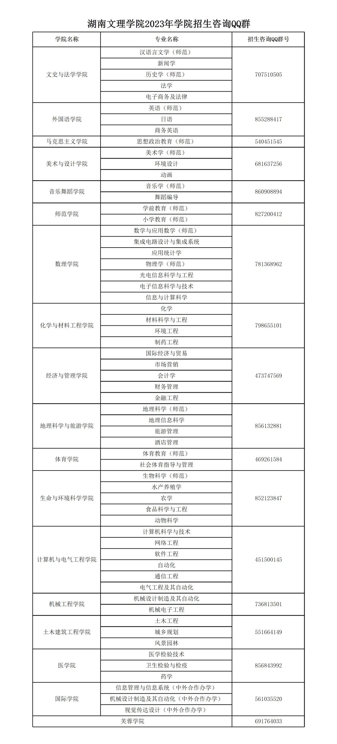 各学院官方咨询QQ群
