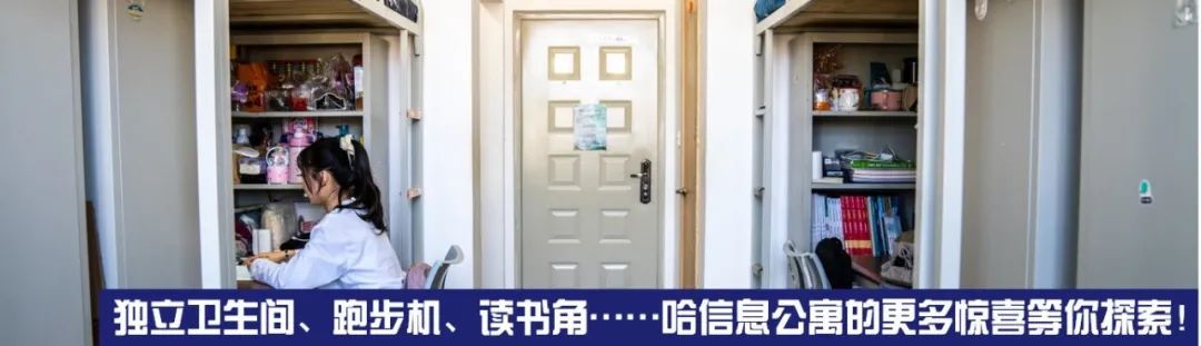 在硬件设施配套方面:哈东校区,标准四人间,每间学生寝室均建设了室内卫生间和盥洗室,一体床;为学生免费提供海绵垫,校园网络全覆盖,智能限电设施投入使用,各楼层热水全时段提供。每栋学生公寓均为学生配备学习室、休闲空间、跑步机、洗衣房、晾衣间、超市等公共场所,彰显服务至上理念。
