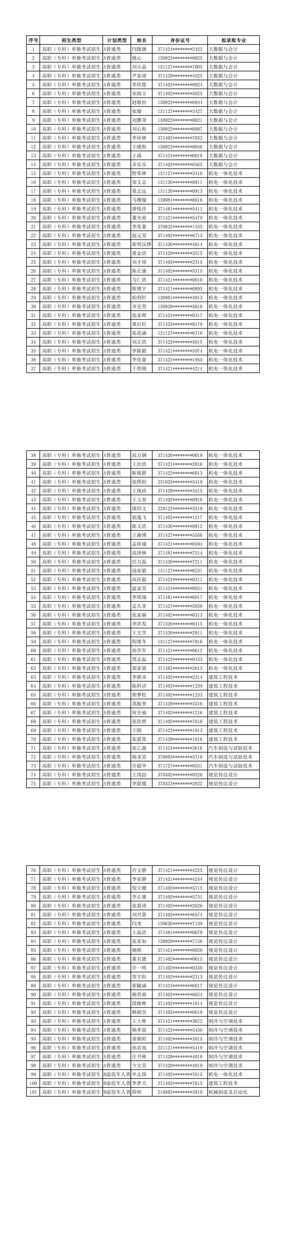 根据《山东省教育招生考试院关于印发山东省2023年高职(专科)单独招生和综合评价招生考试工作指导意见的通知》(鲁招考〔2023〕15号)要求及我校2023年高职(专科)单独考试招生章程规定,经相关考试程序及校招生工作领导小组审批,现将2023年高职(专科)单独招生拟录取名单予以公示,公示期为2023年4月4日-4月6日(名单见下表)。如有问题,请于公示期间及时向我校招生办公室反映,联系电话:招生办公室0534-7023023,教务处0534-7023081。公示结束后,我校将严格按照《山东省教育招生考试院关于办理2023年各类普通高校单独考试招生录取手续工作的通知》(鲁招考〔2023〕11号)要求上报省教育招生考试院,办理相关录取手续,入学时间,另行通知。
