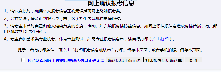 提示:若有打印条件,可点击“打印报考信息确认单”打印、留存本页面,或者手机拍照留存本页面。